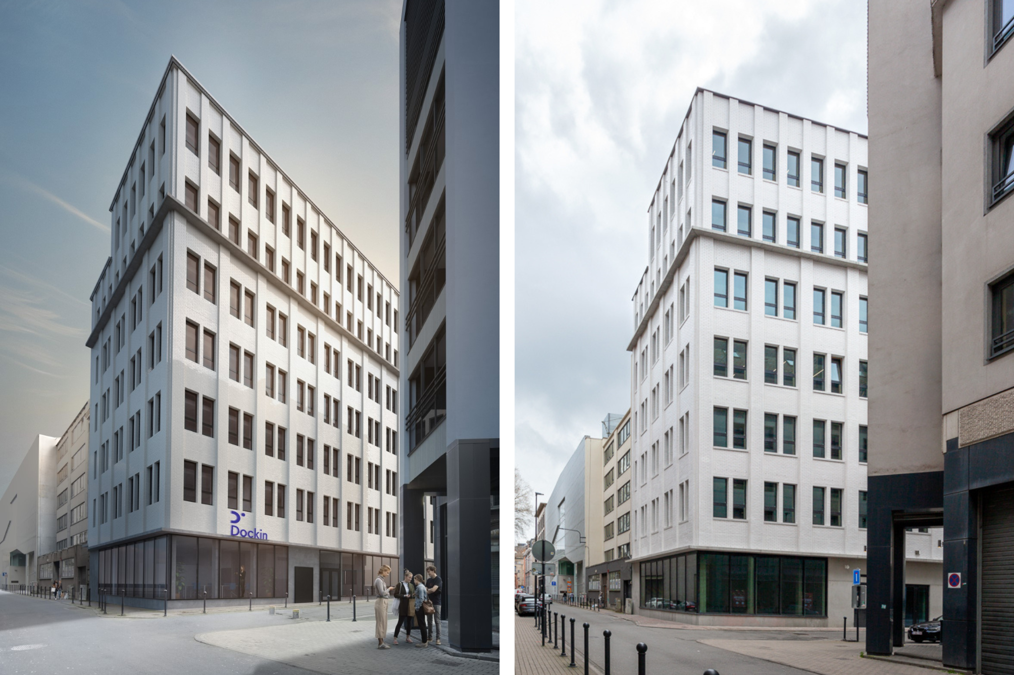 Le Dockin a été conçu pour s’intégrer harmonieusement dans son environnement, au cœur d’un quartier en pleine mutation. Les visuels 3D du projet nous montraient déjà une structure élégante, remplaçant une série de bâtiments vétustes. Aujourd’hui, face au bâtiment terminé, la ressemblance est frappante.