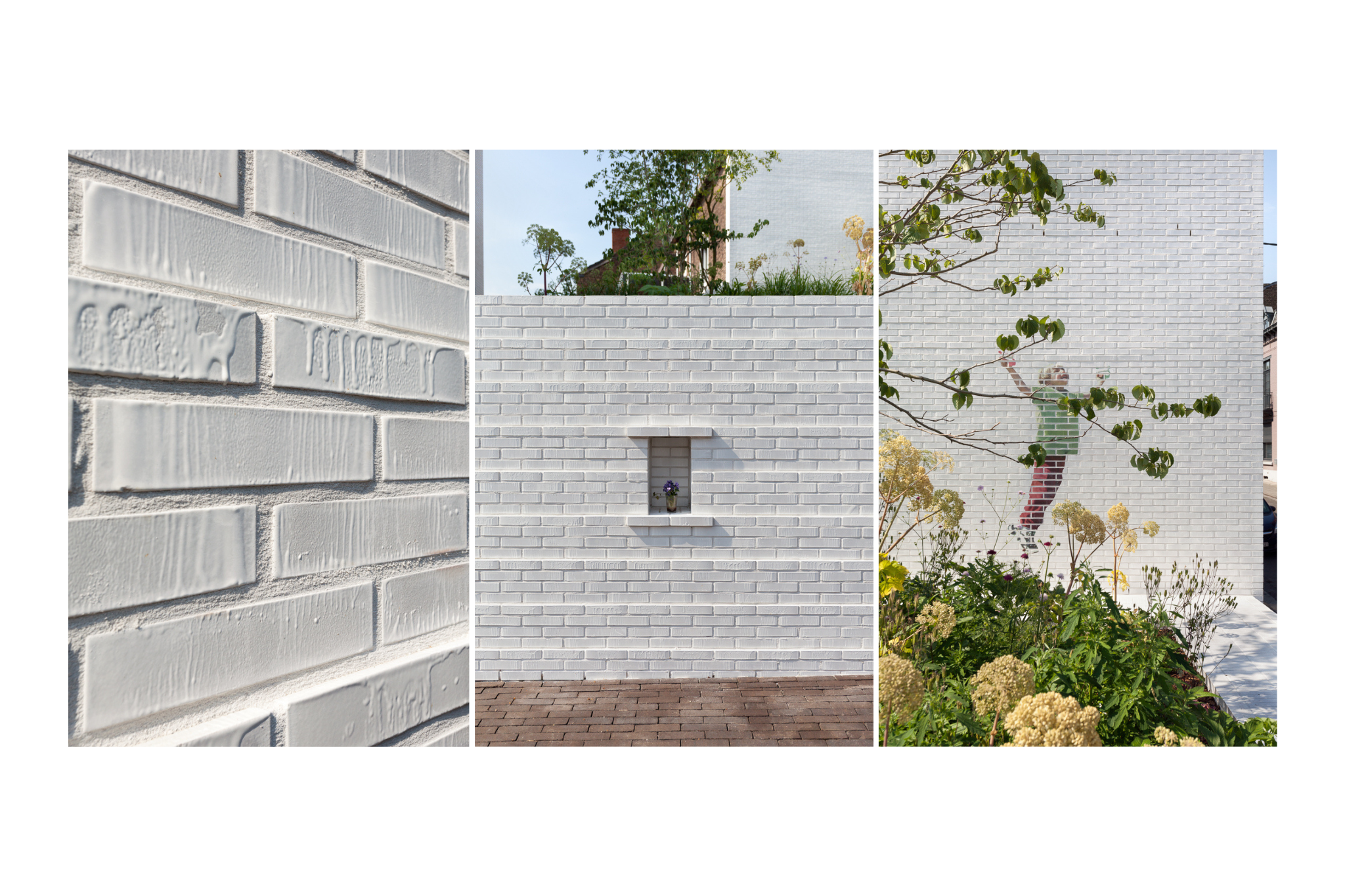 Là où se dressait l’ancienne maison, un jardin a pris vie, un lieu entre terre et ciel, baigné de lumière et de couleurs douces. Protégé par un mur de soutènement, l’espace invite à la sérénité tout en offrant un coin discret, une alcôve en brique, pour se recueillir et déposer une fleur. La brique émaillée blanche sur les murs pignons reflète la lumière, même les jours sombres, symbolisant l’espoir. De plus, une image d’un enfant au cerf-volant, réinterprétée par Christophe Terlinden, vient habiller l’un des murs, rappelant un symbole cher au quartier.