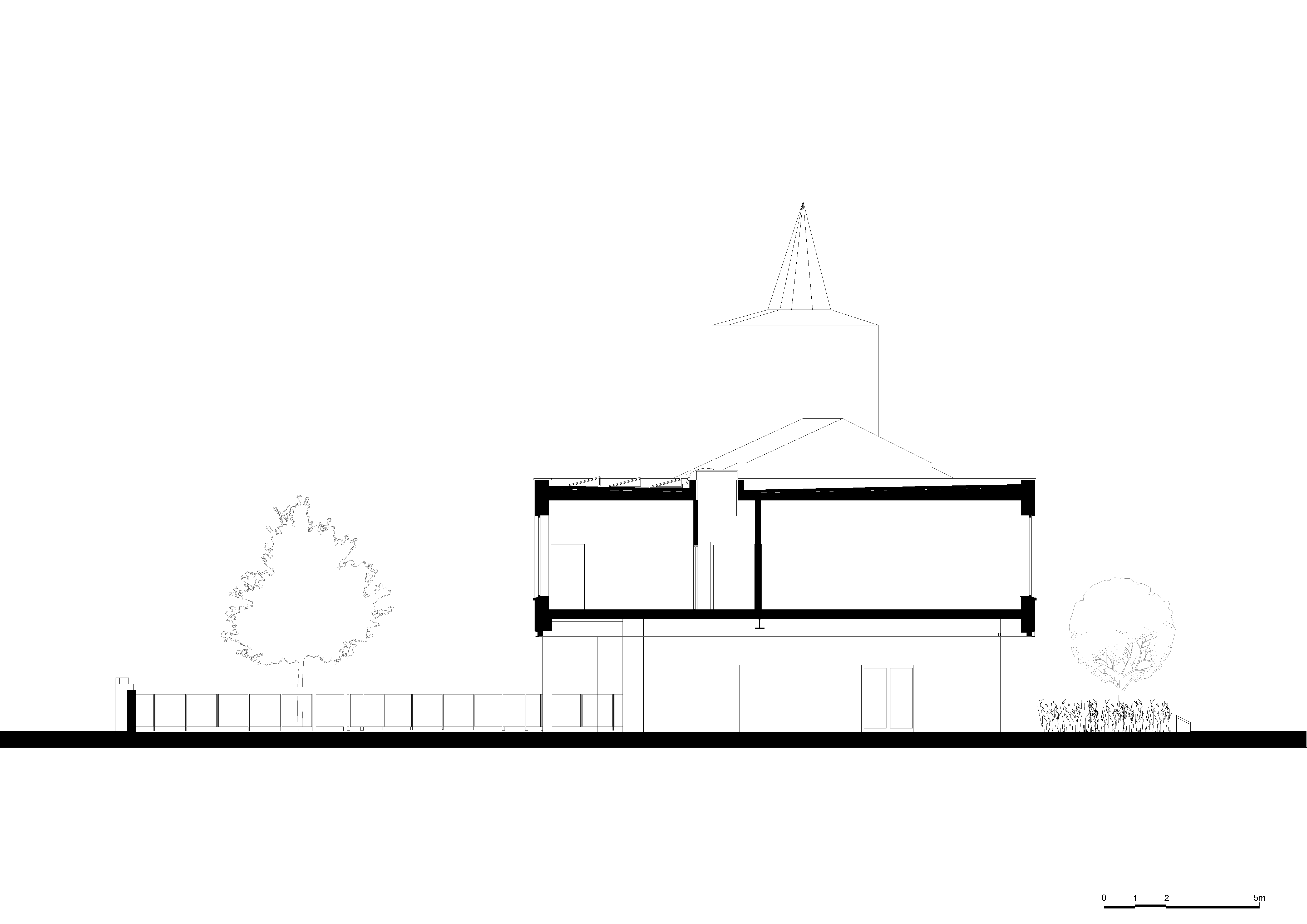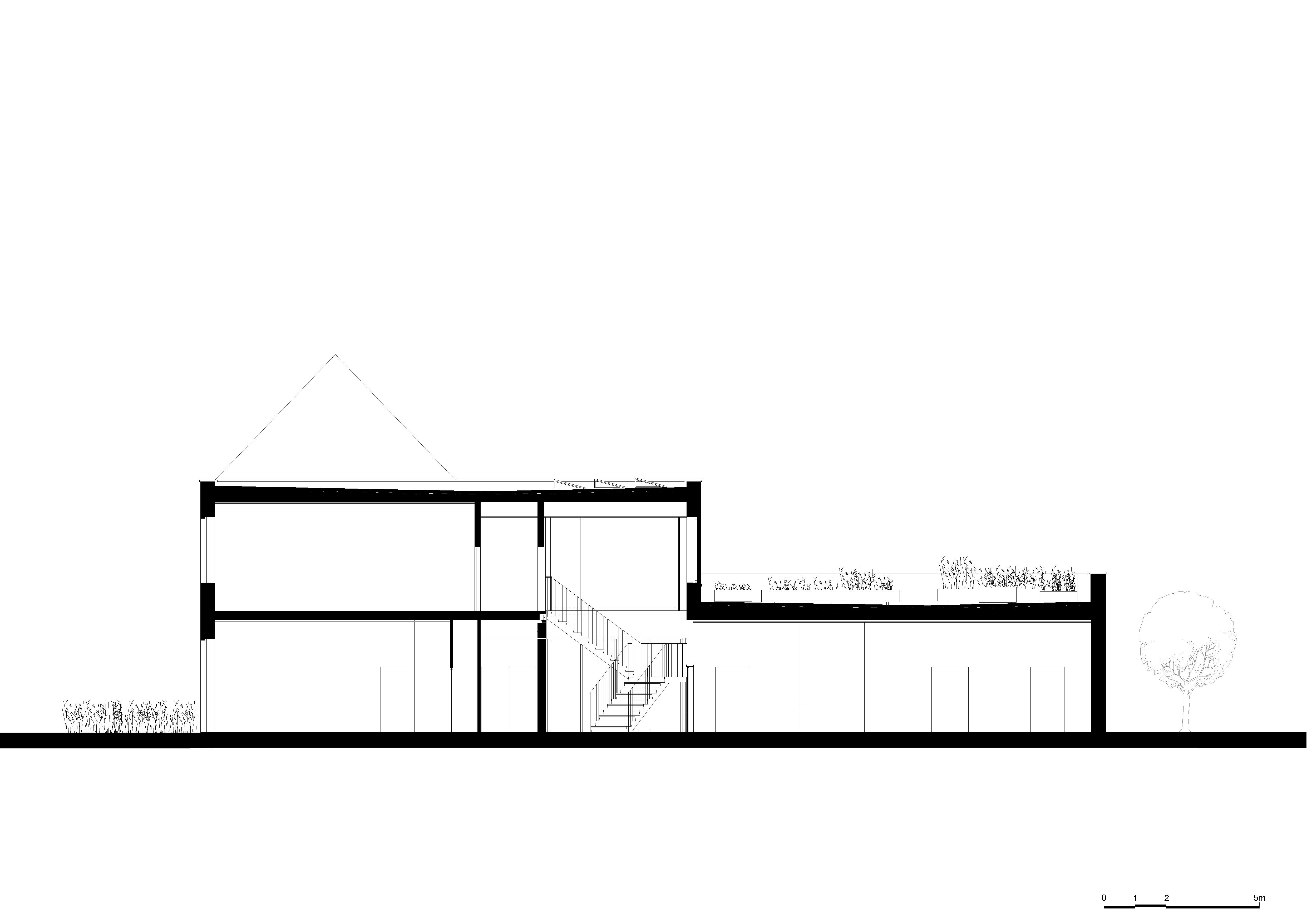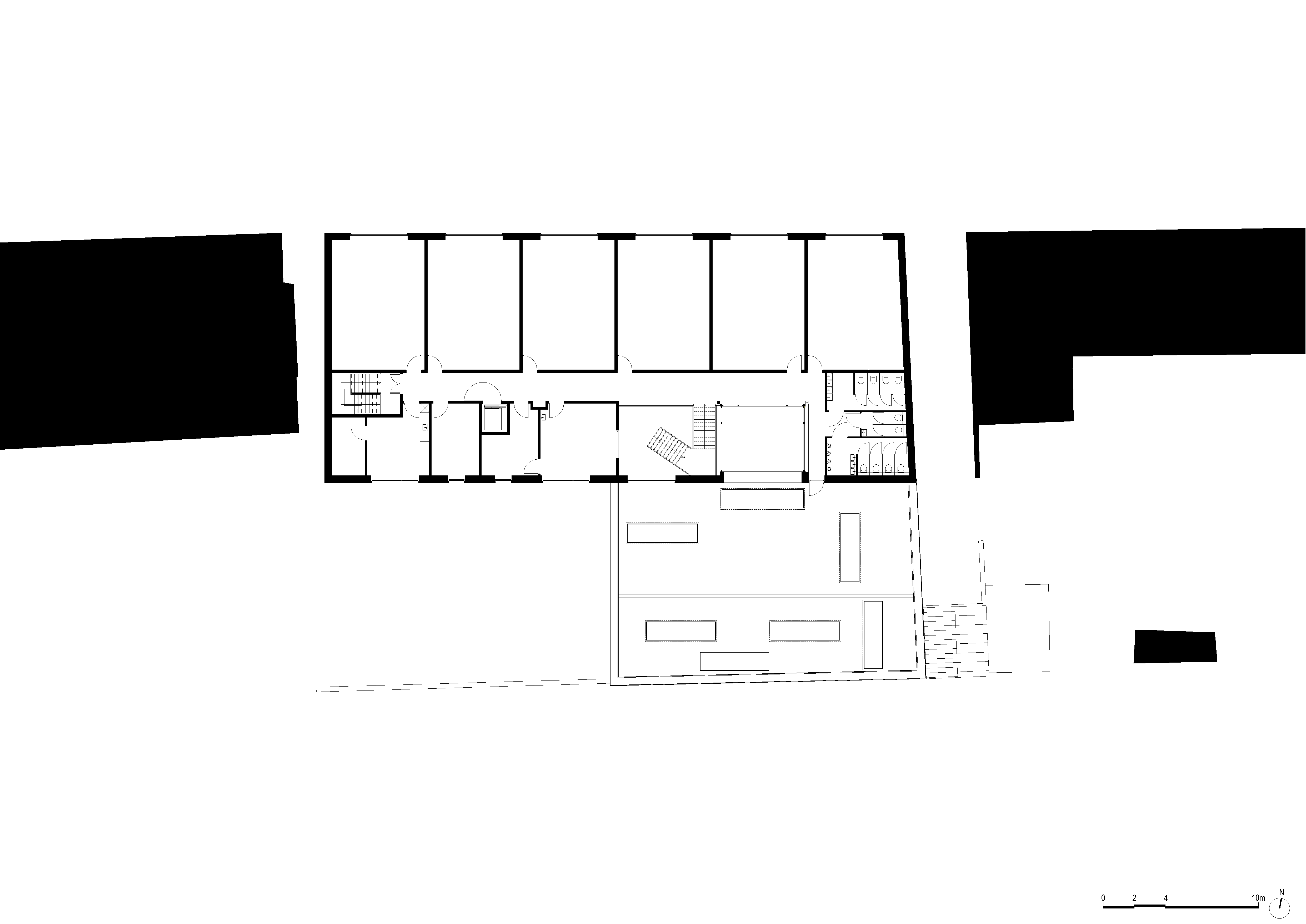 L’implantation en L libère un quart de la parcelle pour la cour de récréation. Le rez-de-chaussée accueille bibliothèque publique, les classes maternelles et une salle polyvalente. Ces programmes prennent place dans des volumes séparés et peuvent ainsi fonctionner indépendamment. Les classes de primaire ont été placées à l’étage pour les distancer de la cour et de l’espace public, afin de leur offrir du calme, propice à la concentration des élèves.